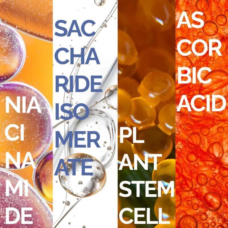 Aqua (Water), Niacinamide, Pentylene Glycol, Ethoxydiglycol, Glycerin, 3-O-Ethyl Ascorbic Acid, Zinc PCA, Hydroxyethylcellulose, Saccharide Isomerate, Sodium Hyaluronate, Hydrolyzed Glycosaminoglycans, Hydrolyzed Hyaluronic Acid, Hyaluronic Acid, Sodium Hyaluronate Crosspolymer, Propanediol, Hamamelis Virginiana Leaf Extract, Ozonized Oryza Sativa (Rice) Callus Culture Extract, Citrus Paradisi Fruit Extract, Citrus Aurantium Dulcis Peel Extract, Camellia Sinensis Leaf Extract, Phenoxyethanol, Benzoic Acid, Caramel, Sodium Citrate, Propylene Glycol, Phosphatidylcholine, Hydrogenated Lecithin, Sodium Acetate, Isopropyl Alcohol, Polysorbate 80, Tocopheryl Acetate, Ascorbyl Palmitate, Xanthan Gum, Raspberry Ketone, Tocopherol, Ethylhexylglycerin, Benzyl Glycol, Potassium Sorbate, Sodium Benzoate, Citric Acid.