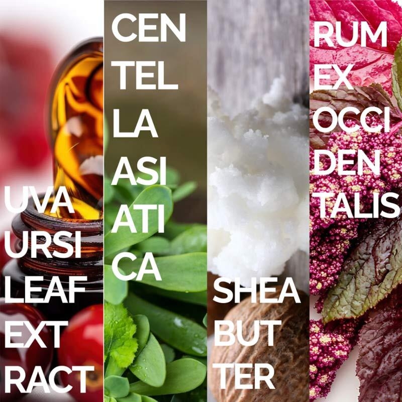 Aqua (Water), Glycerin, Caprylic/Capric Triglyceride, C12-15 Alkyl Benzoate, Cyclopentasiloxane, Butyrospermum Parkii (Shea) Butter, Dimethicone, Sodium PCA, Phenoxyethanol, Dimethiconol, Glyceryl Stearate, PEG-100 Stearate, Sodium Acrylates Copolymer, Lecithin, Cetearyl Alcohol, Rumex Occidentalis Extract, Arctostaphylos Uva Ursi Leaf Extract, Glycyrrhiza Glabra Leaf Extract, Centella Asiatica Leaf Extract, Aloe Barbadensis Leaf Juice, Oenothera Biennis (Evening Primrose) Oil, Benzoic Acid, Ethylhexylglycerin, Tocopheryl Acetate, Tetrasodium EDTA.