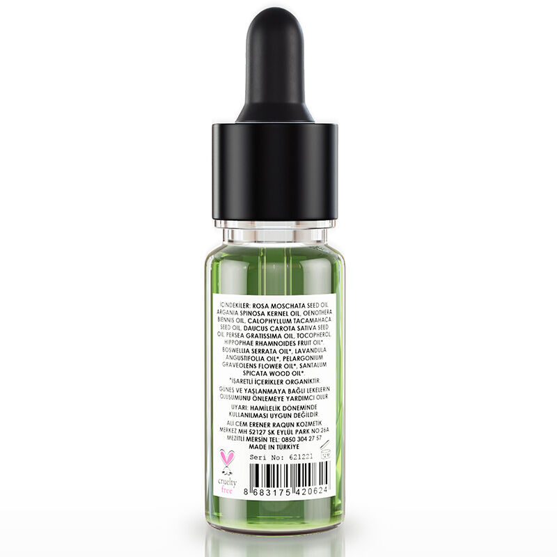 %100 doğal sabit yağlar ve organik uçucu yağlar içeren bakım serumu.