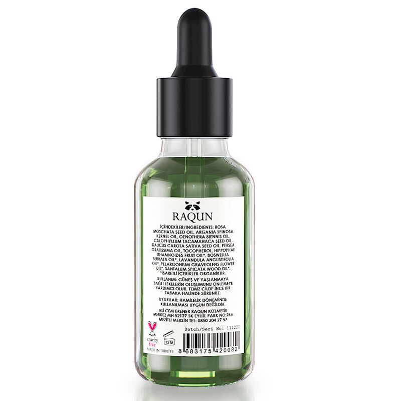 %100 doğal sabit yağlar ve organik uçucu yağlar içeren bakım serumu.