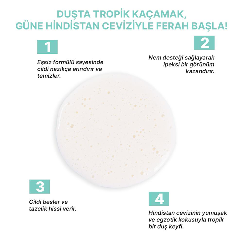 - Formülündeki Hindistan cevizi özleri ile cildi nemlendirmeye yardımcı olur ve cilde pürüzsüz bir görünüm sunar.