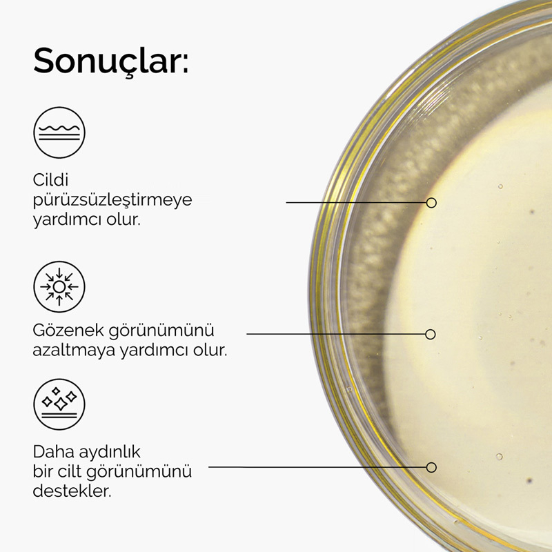 Cildi arındırmaya yardımcı olarak daha pürüzsüz ve eşit tonda bir cilt görünümü sağlar. Daha aydınlık bir cilt görünümü sağlamaya yardımcı olurken ince çizgi ve kırışıklık görünümü gibi yaşlanma belirtilerine karşı bakım sağlar.