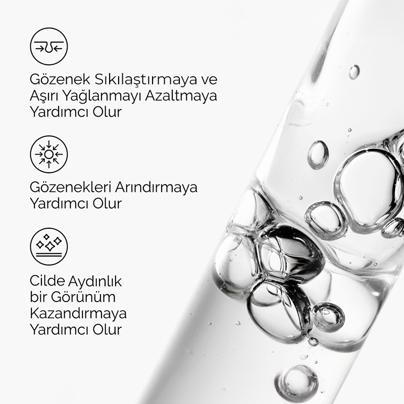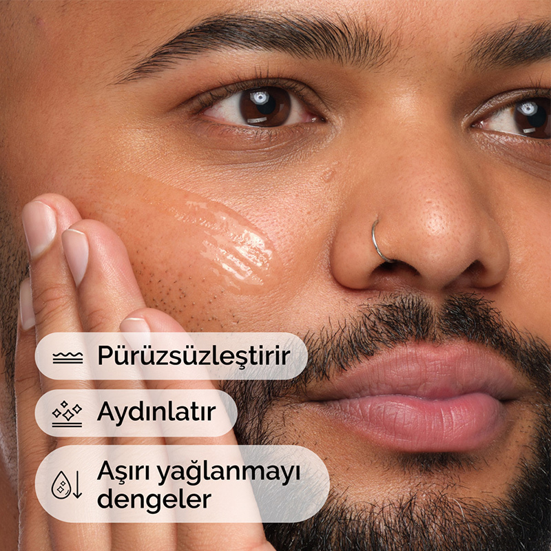 Niasinamid (B3 vitamini) ve Çinko PCA içeren formülüyle cildin pürüzüsüz görünmesini hedefler.