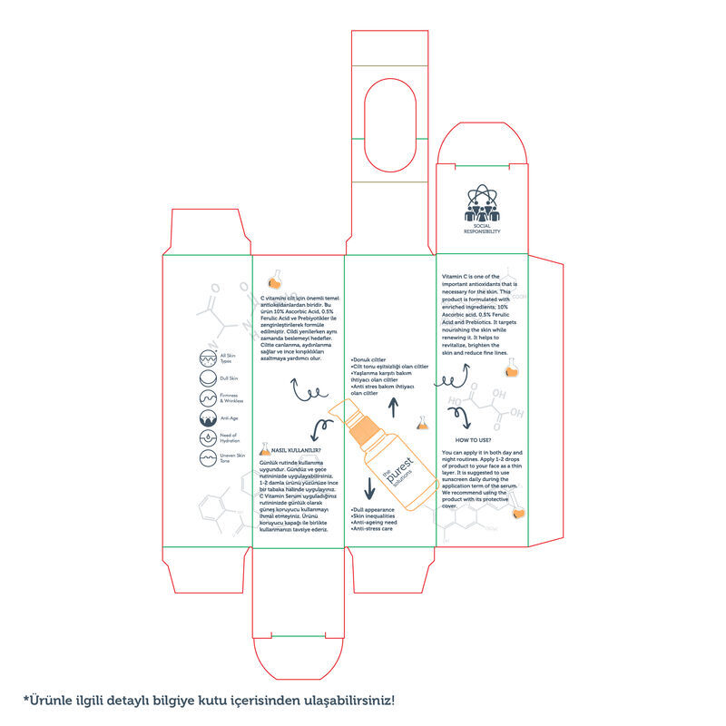 Bu ürün 10% Ascorbic Acid, 0.5% Ferulic Acid ve Prebiyotikler ile zenginleştirilerek formüle edilmiştir.