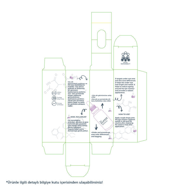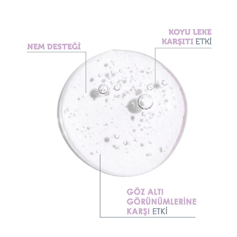 Göz çevresinde oluşan yaşlanma görünümünün azalmasına yardımcı olarak göz çevresine bakım yapar ve ışıltılı bir görünüm sağlar.Vegan ve Hayvan Dostudur.