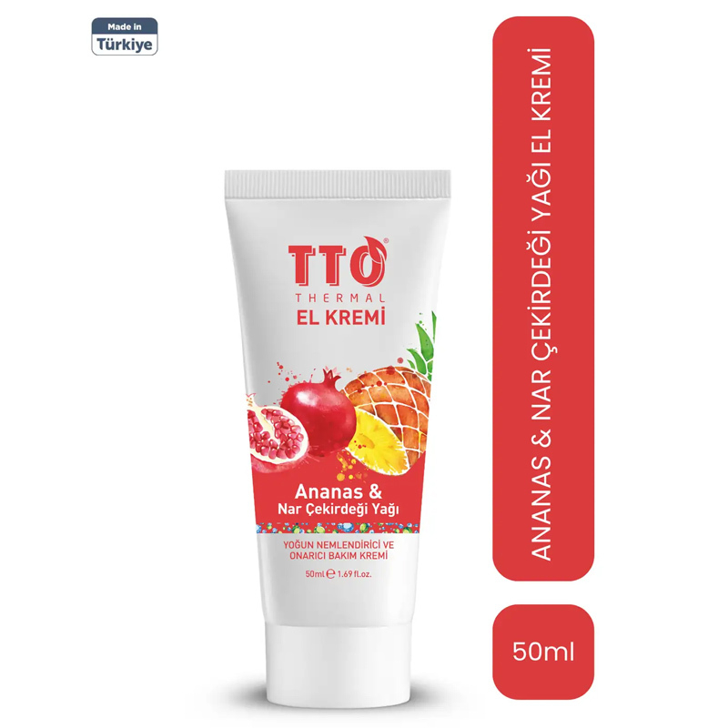 Ananas ekstresi ve nar çekirdeği yağı ile zenginleştirilmiş TTO Thermal El Kremi, cildinize derinlemesine nem sağlarken, aynı zamanda antioksidan koruma sunar. Ananasın doğal özleri, cildin daha canlı ve parlak görünmesine katkıda bulunurken, nar çekirdeği yağı serbest radikallere karşı korur.