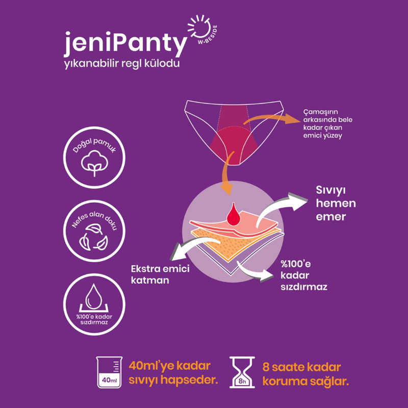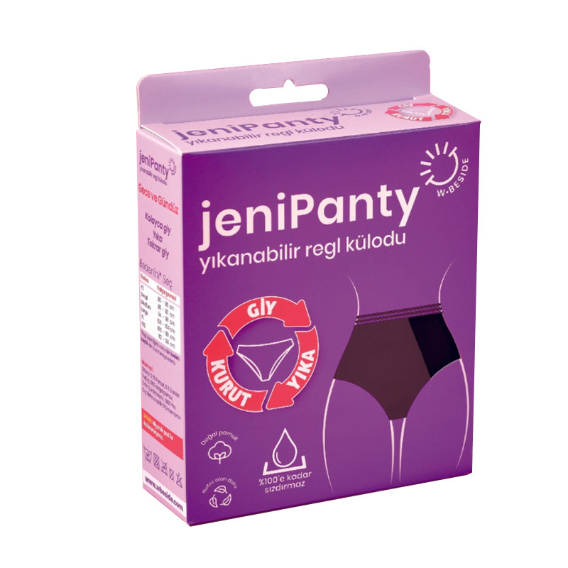 jeniPanty Pamuk, Yıkanabilir, Sızdırmaz Külodu İç çamaşırı konforu, emici ped rahatlığı jeniPanty, tek kullanımlık ürünlerinden daha hijyenik, sürdürülebilir ve aynı zamanda çevre dostudur.