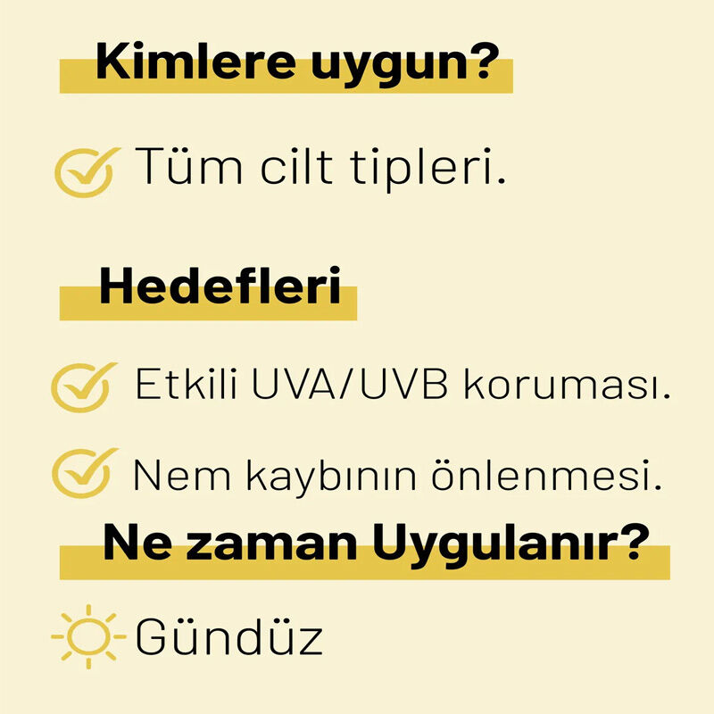 Formülünün beyazlık veya kalıntı bırakmayan yapısı, güneş korumasını günlük cilt bakım rutininize kolayca eklemenizi sağlar.